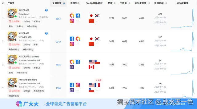 再来看看游戏海外的投放情况,目前游戏4个广告主截止到发稿日累计去重后创意已经超过1.7万条,且游戏在北京时间8月28日全球上线的时候,还迎来了一波素材爆发,广大大当天抓取全球超过超过1万条。