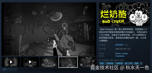 当【茶杯头】全球爆火以后,也有越来越多的游戏厂商尝试将这一特殊的美术风格与游戏产品想结合,最近Steam平台就有上线一款心理恐怖的《烂奶酪(Bad Cheese)》,还有主打黑白橡皮管动画+第一人称射击的《神探杰克鼠》。