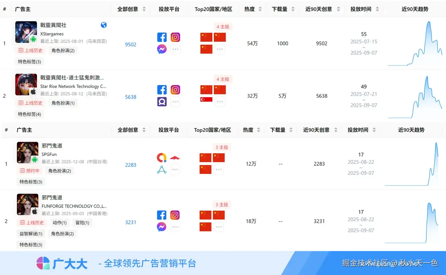 而近期有2款游戏投放力度很大,一个是由XStargames负责发行的【戰靈異聞社】另一个则是由露珠游戏负责发行的【邪門鬼道】,这两款游戏8月份双端去重后的创意都超过5000条。