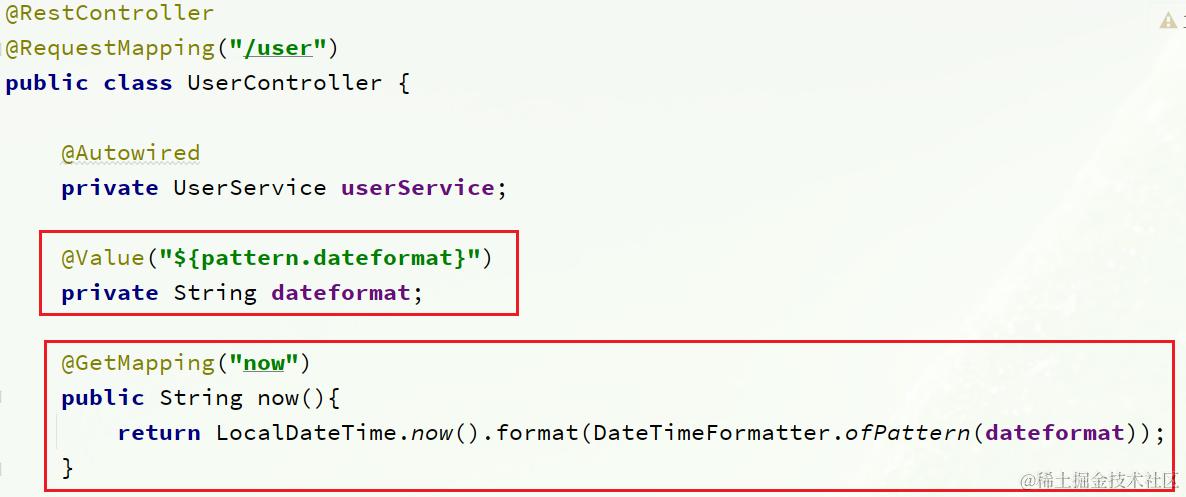 在user-service服务中,添加一个类,读取patterrn.dateformat属性:
