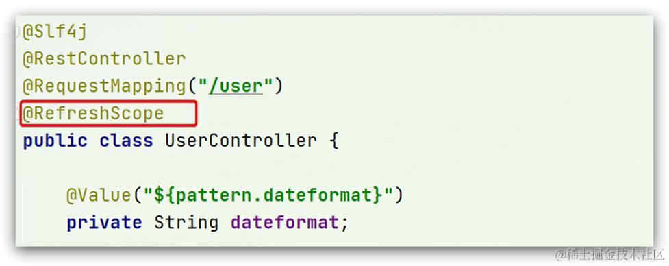在user-service中的UserController中添加业务逻辑,读取pattern.dateformat配置: