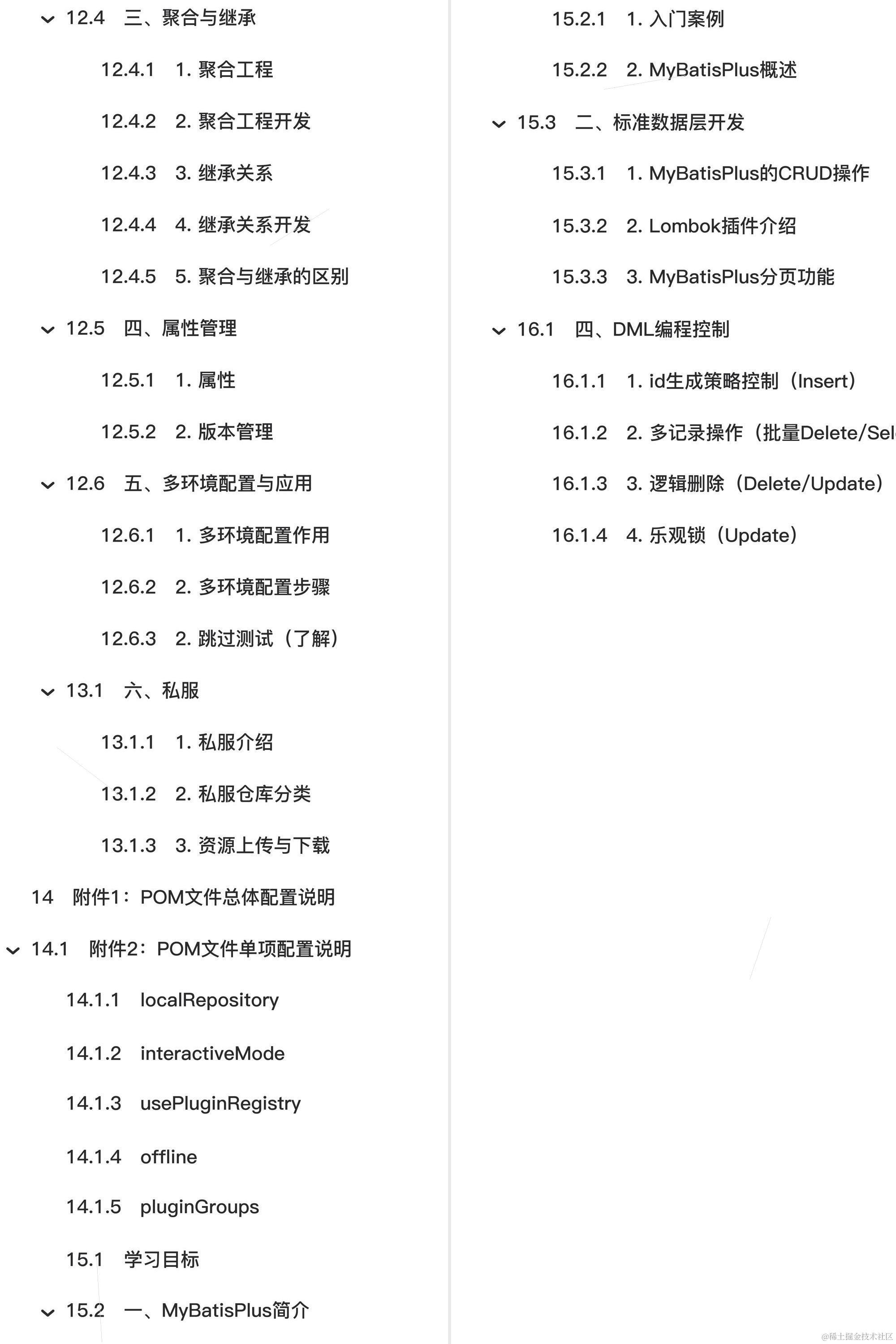 🏆🏆🏆教程全知识点简介:学习目标 一、Spring简介 2 初识Spring 3 Spring体系结构 二、IOC和DI入门案例【重点】 五、Bean的生命周期【了解】 问题导入 1 生命周期相关概念介绍 2 代码演示 3 Bean销毁时机 六、依赖注入(DI配置) 1 依赖注入方式【重点】 2 依赖自动装配【理解】 3 集合注入 今日目标 一、第三方资源配置管理 1 管理DataSource连接池对象 2 加载properties属性文件【重点】 四、Spring整合其他技术【重点】 二、AOP案例 1 案例-测量业务层接口万次执行效率 2 AOP切入点数据获取 2 Spring事务角色【理解】 二、请求与响应 1 请求映射路径【重点】 2 请求参数 3 日期类型参数传递【重点】 4 响应 三、REST风格 1 REST简介 2 RESTful入门案例 3 REST快速开发【重点】 今日内容 一、SSM整合【重点】 1 SSM整合配置 三、异常处理器【理解】 1 异常介绍 2 异常处理器 一、分模块开发与设计 1. 分模块开发的意义 模块拆分原则 2. 分模块开发(模块拆分) 二、依赖管理 1. 依赖传递 2. 可选依赖 4 可选依赖和排除依赖的区别 三、聚合与继承 1. 聚合工程 3. 继承关系 5. 聚合与继承的区别 四、属性管理 1. 属性 2. 版本管理 五、多环境配置与应用 1. 多环境配置作用 2. 跳过测试(了解) 六、私服 2. 私服仓库分类 3. 资源上传与下载 附件1:POM文件总体配置说明 一、MyBatisPlus简介 1. 入门案例 二、标准数据层开发 2. Lombok插件介绍 四、DML编程控制 1. id生成策略控制(Insert) 2. 多记录操作(批量Delete/Select) 3. 逻辑删除(Delete/Update) 4. 乐观锁(Update)