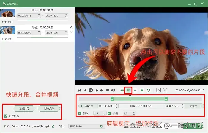 步骤3:录完发现开头空镜头,或者中间不小心咳嗽了一声?直接点击软件里的 “高级剪辑” ,拖动进度条选中要删的片段,点击 “删除” 就行。要是想给不同内容加个转场,也可以选个 “淡入淡出” 特效,视频瞬间变丝滑。