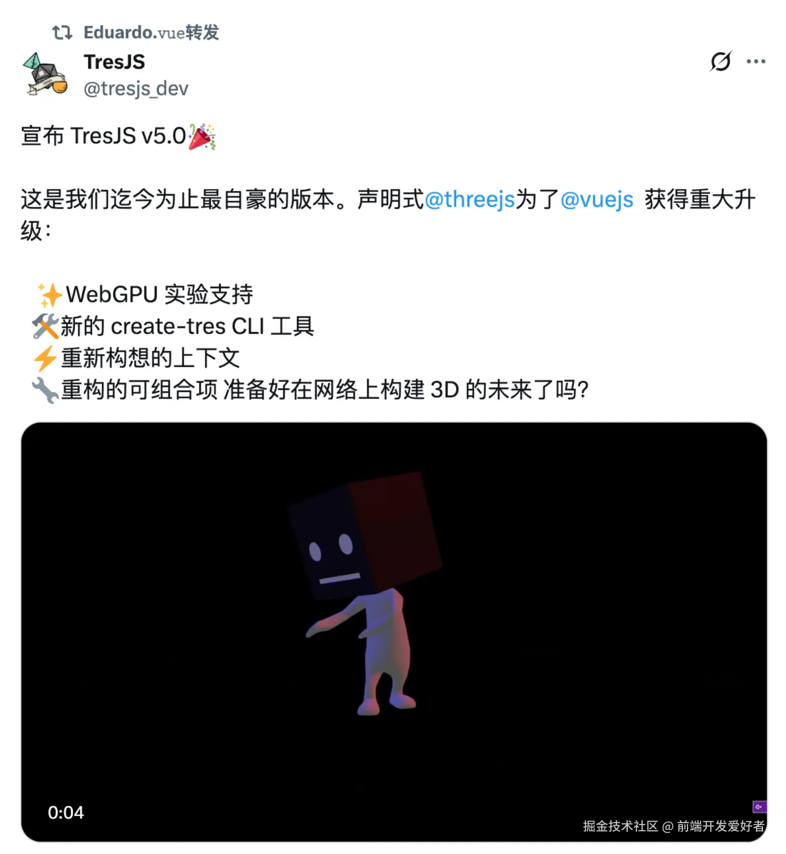 从最初的一个**“小而美”**的实验性项目,到如今 功能完备、架构现代、生态丰富的 3D 框架,TresJS 完成了一次华丽的蜕变。