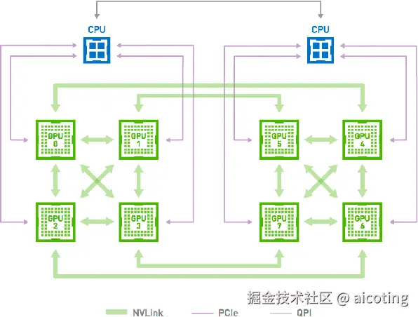 - 节点通信:节点间通过高速互连(如 NVLink、InfiniBand)交换梯度信息,通信延迟和带宽是分布式训练性能的关键瓶颈。