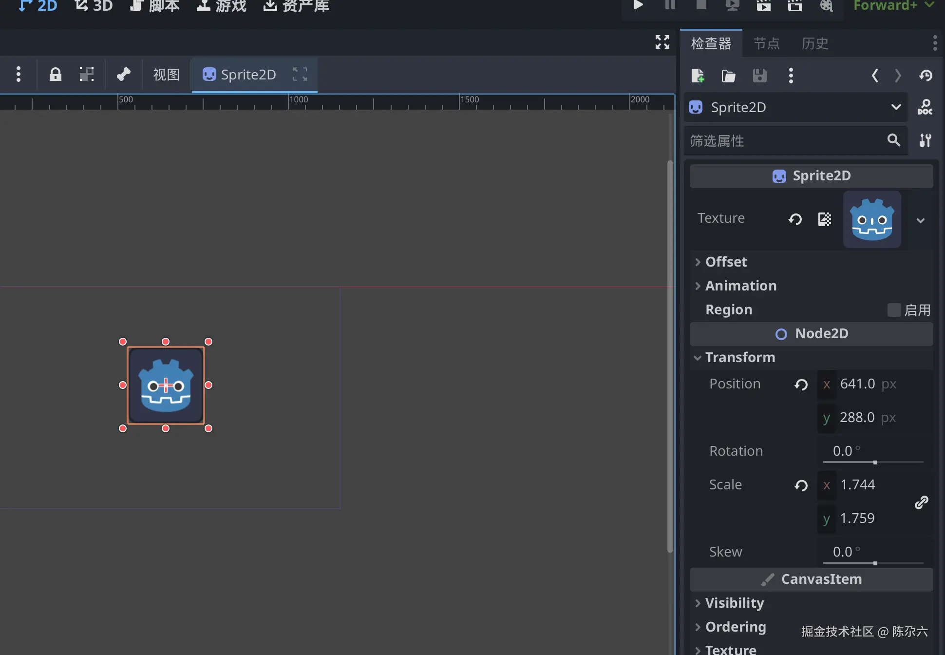 贴图类节点(如 Sprite2D)缩放后只是视觉放大;碰撞形状(CollisionShape2D)则会真正影响物理范围——后面章节会讲差异。