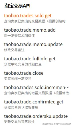 在淘宝开放平台中有一类API,叫交易API。里面有关于交易的一些API接口。比如查询卖家已卖出的交易数据,获取单笔交易详情信息,获取交易确认收货费用等。