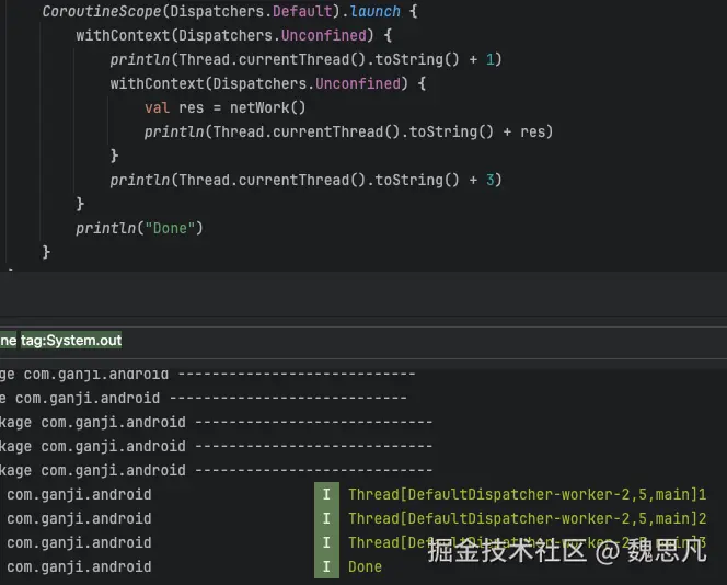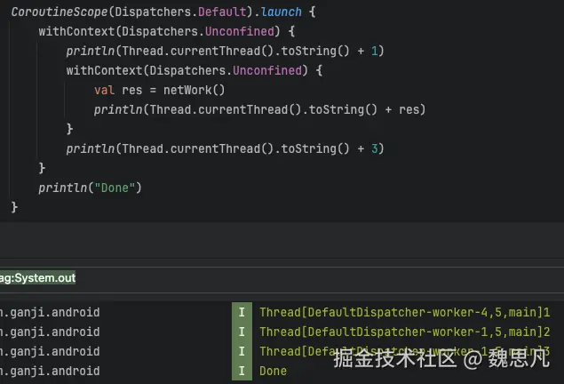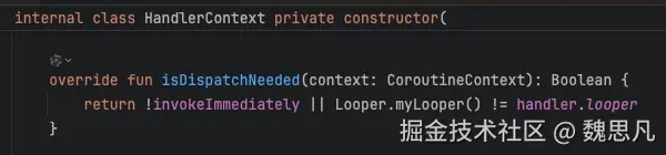 这里涉及到一个关键的逻辑,if (dispatcher.isDispatchNeeded(context)) ,具体执行的效果跟不同的 Dispatcher有关。对于 Dispatchers.Main 的逻辑是这样的,非立刻执行 或者 当前运行线程的 looper 和 dispatcher 的不同。 结合下表和下图代码理解,第一行和第二行对应于 Dispatchers.Main,第三行和第四行对应于Dispatchers.Main.immediate,dispatch 结果为 true 则走调度器分发,即 post{}。总结表格可得,只有在主线程用 immediate 创建的协程才会阻塞当前线程。
