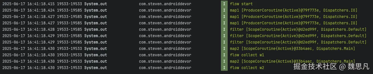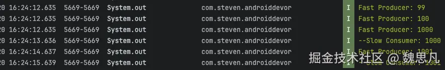 - 作用:新值到来时,立即取消正在处理的旧任务,开始处理新值。这里的旧任务指的是 collectLatest 的子协程。假如 100 毫秒以内来了一个新的值,那么旧的值只会打印 "Collected: $value",没有"Collected delay: $value"。