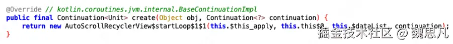 SuspendLamda 继承自 ContinuationImpl,ContinuationImpl 又继承自 BaseContinuationImpl,所以 block 满足 is BaseContinuationImpl 的条件。最后调用了block#create。