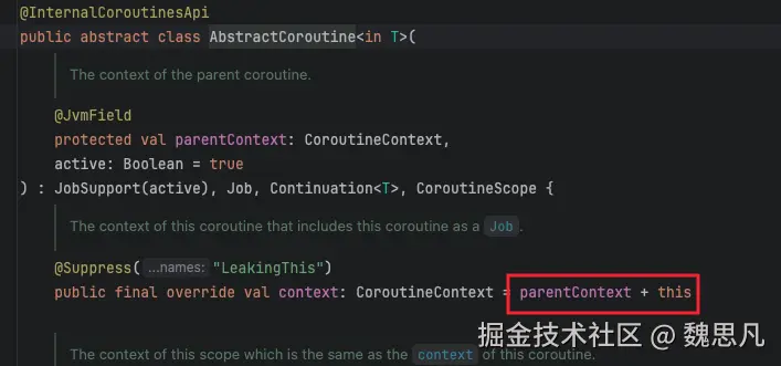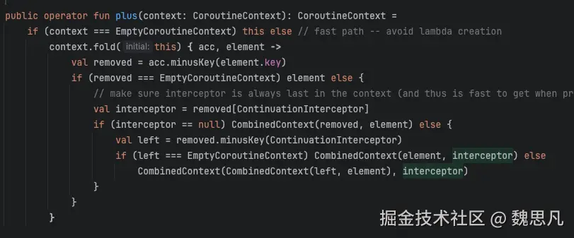 使用 fold 方法遍历待合并的 context 中的每个元素。acc 是累积的上下文,初始值为当前的 CoroutineContext 实例;element 是当前正在处理的 CoroutineContext 元素。