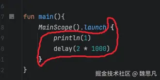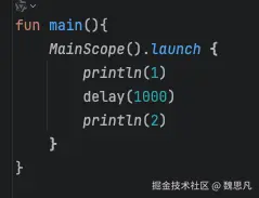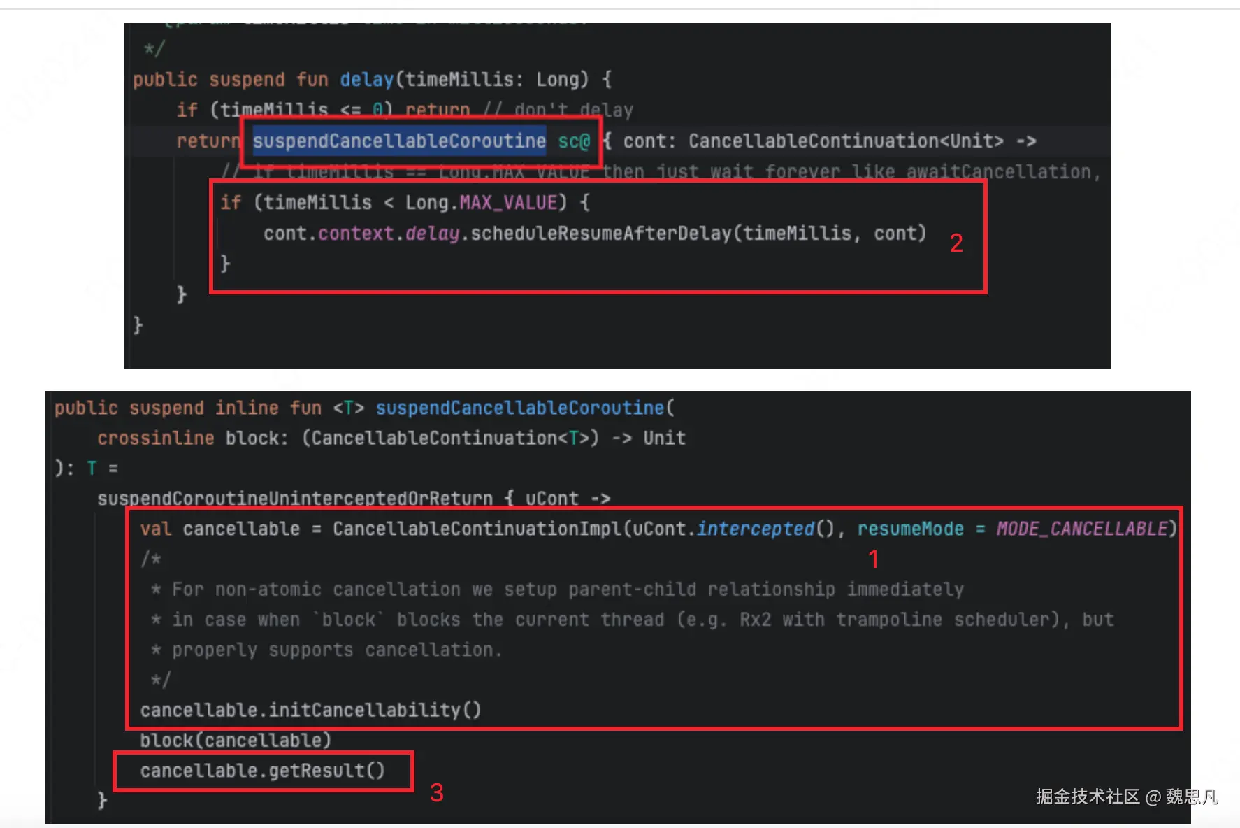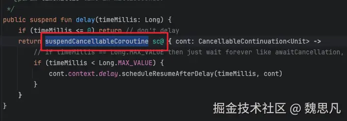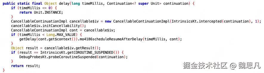 第三步,调用 delay 方法,并把父协程传进入,该方法会返回一个 suspend 的挂起标识符,判断将为 true,则挂起,挂起即 return。
