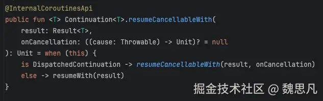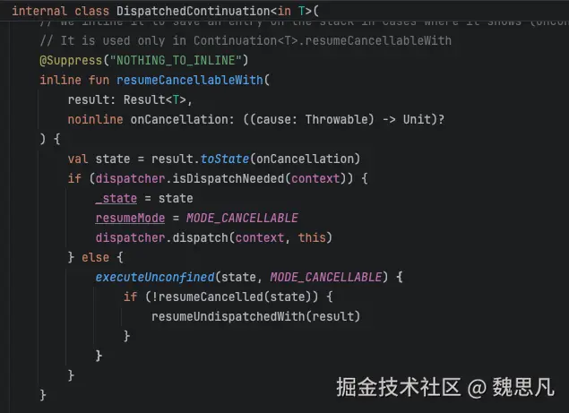根据上面的分析可以知道 this 符合 is DispatchedContinuation 的条件,进入 DispathedContinuation 的 resumeCancellableWith