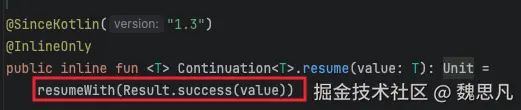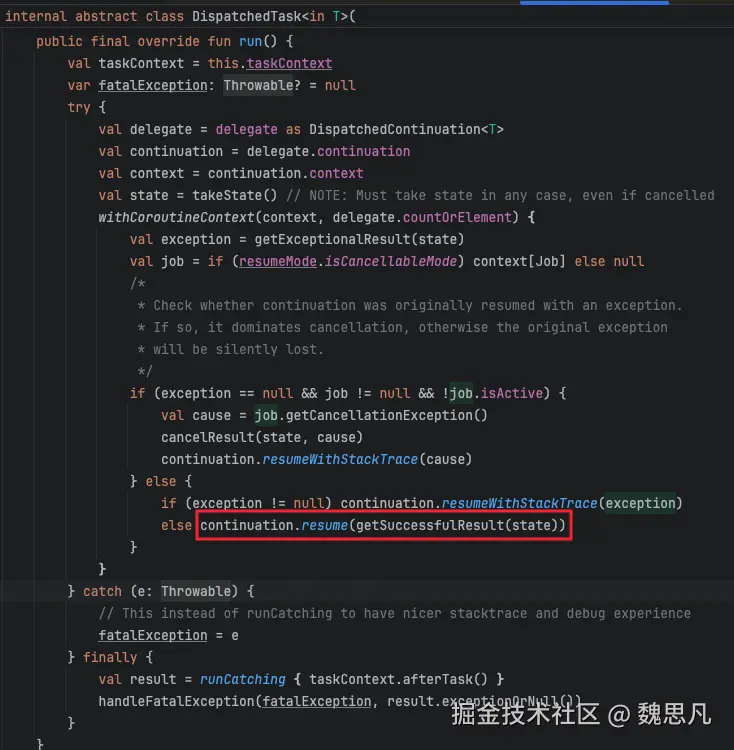 根据 DispatchedContinuation 的构造参数和上述分析,delegate.continuation 即 (suspend () -> T),没有 exception 的情况下正常走到 (suspend () -> T)#resume。