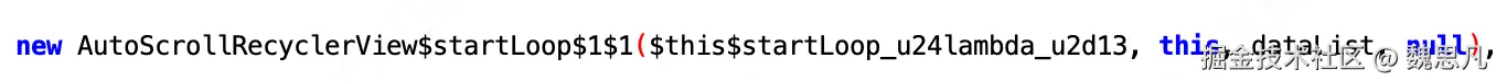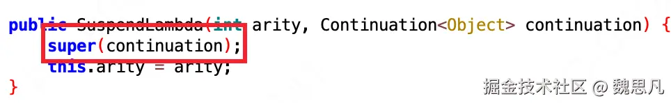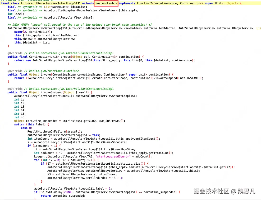 4.1.1 根据前面的分析,可以知道这个方法传参都是 StandaloneCoroutine,this 即我们最初写的 block。这个地方单纯看 kotlin 代码已经看不明白了,反编译后之后可以看到 block 被编译为一个匿名对象,且继承自 SuspendLamda。