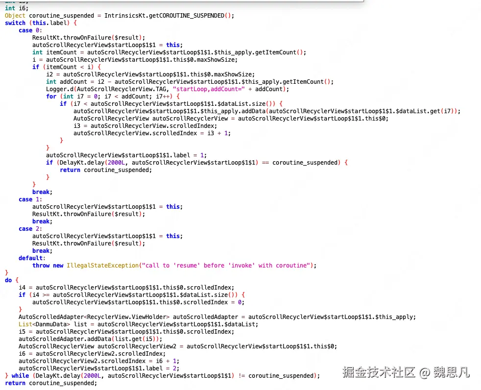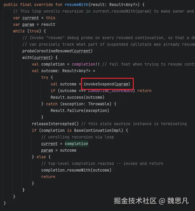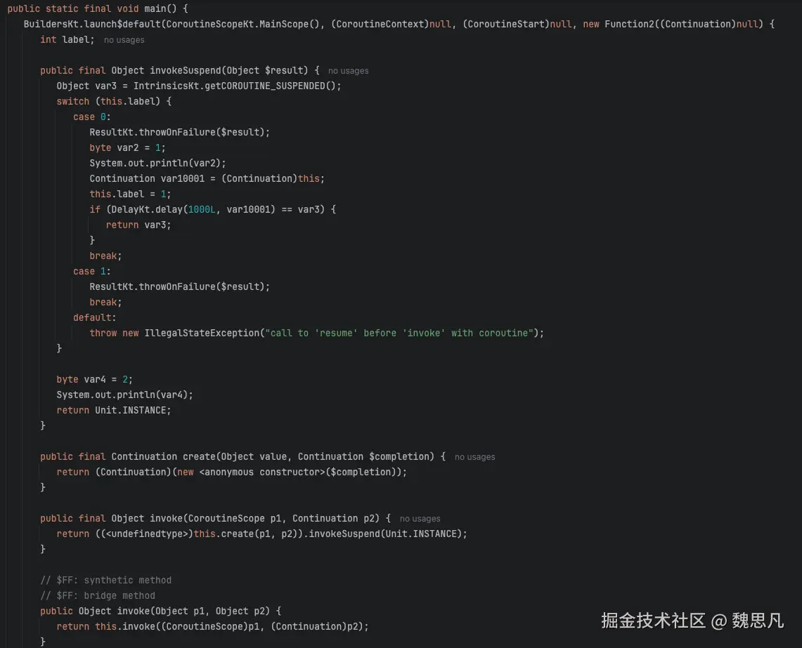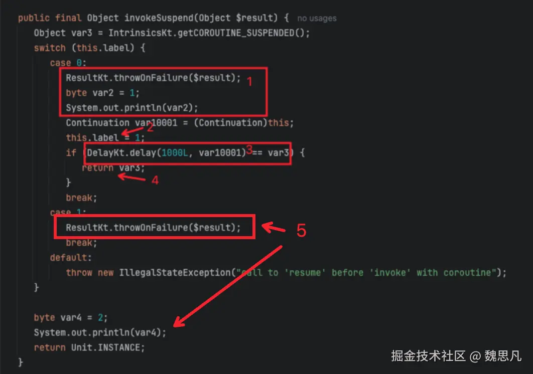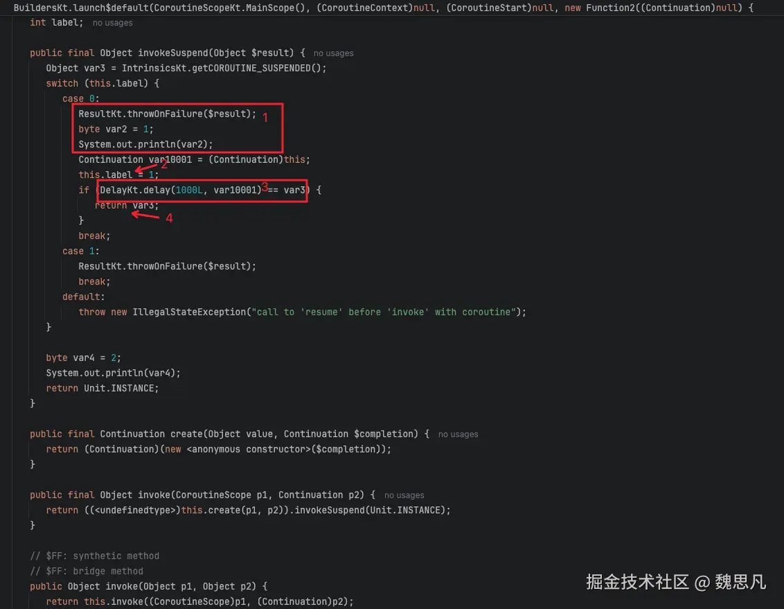 真正让协程挂起与恢复的秘密就是协程中这块状态机代码,它就在 invokeSuspend 方法中,跟随编译生成。