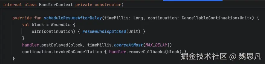 HandlerContext 的 scheduleResumeAfterDelay 实现如下。通过 postDelay 的方式将协程中需要运行的代码用 Runnable 包裹抛了出去,进而实现了协程的“恢复”。