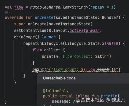 以上代码输出结果是“value 第二条”。first() 会让协程挂起,直到有地方 emit 才会恢复协程,虽然内部也是通过 collect 来实现的,但 first 却不是一个阻断操作。需要注意的是,这个规则取决于 flow 本身,因为 SharedFlow 如果 replay = 1,在注册 collect 时,内部会自动 emit,虽然看起来自己并没有调用 emit,但这是 SharedFlow 的内部机制。如果改为*val sharedFlow = MutableSharedFlow<String>(replay = 1)* ,则会输出“value 第一条”。