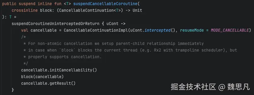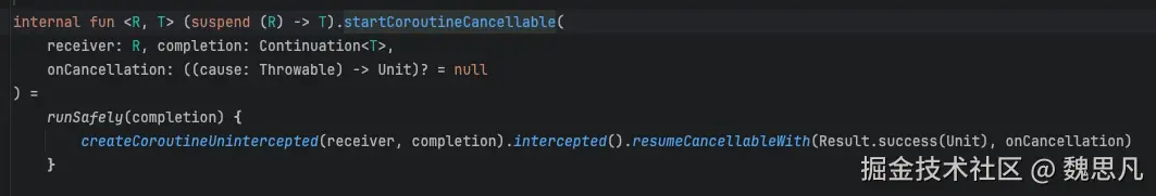 启动模式为 default,进入 block 的 startCoroutineCancellable,这里 startCoroutineCancellable 是一个扩展函数,即对象类型为suspend () -> T的一个扩展方法方法。