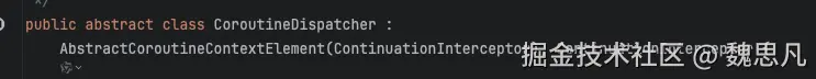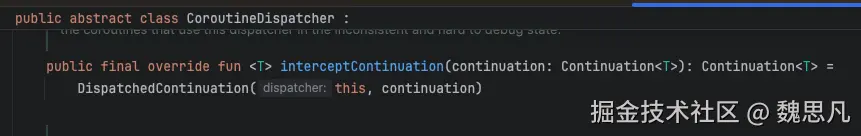 根据 plus 的逻辑,本次加法为最终的计算结果是 CombinedContext(StandaloneCoroutine, Dispatchers.Main)。由此我们已经知道了 4.2 中的 context 为 CombinedContext(StandaloneCoroutine, Dispatchers.Main),且有 ContinuationIntercept,为 Dispatchers.Main。然后继续 4.2 往下,进入 interceptContinuation,Dispatchers.Main的本质是一个 HandlerContext,HandlerContext 并未重写这个方法,最终追到CoroutineDispatcher#interceptContinuation。