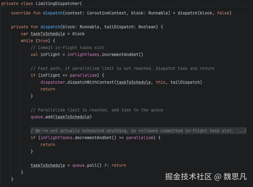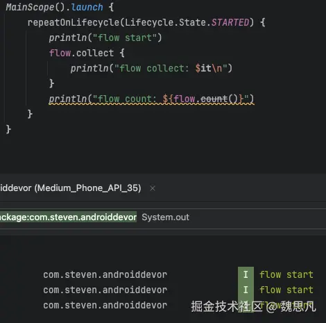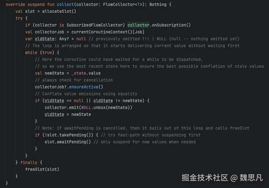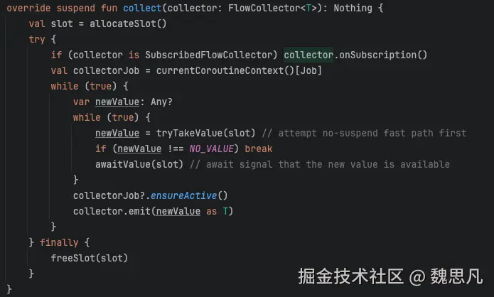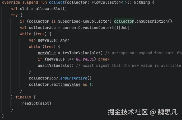 这个秘密在 SharedFlow 的 collect 方法中,内层的 while 循环判断有没有新的值,如果没有则挂起,如果有则发送出去,其中 awaitValue 是一个挂起函数。另外,外层的 while 循环便可以解释为什么 collect 是一个阻断操作,因为要么循环执行,要么协程挂起,永远跳不出去。