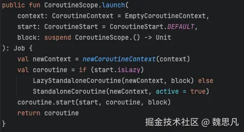 调用 launch 之后,我们的业务代码作为参数 block 传入,根据协程的启动模式创建一个 coroutine,再次将 block 透传进入到 coroutine 中,start==CoroutineStart.DEFAULT,这里创建的协程就是 StandaloneCoroutine。进入StandaloneCoroutine#start