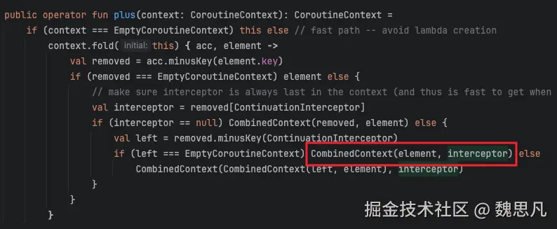 left是EmptyCoroutineContext,则将当前元素element和ContinuationInterceptor元素组合成新的CombinedContext。 - 否则,将