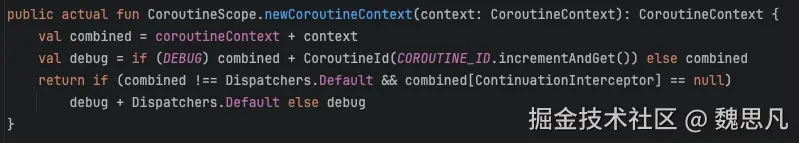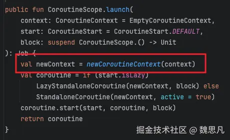 所以 context 即协程 StandaloneCoroutine 绑定的 context。回到 launch 中,查看 Context 的创建过程