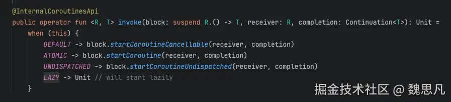 这里相对有一些绕,start 方法内有一个启动模式的 start 变量,方法内部的 start(...)是调用了启动模式 start 变量的 invoke()方法,即 CoroutineStart#invoke。注意第二个参数 receiver 是第一步中传入的 StandaloneCoroutine,第三个参数传入的 this,即 StandaloneCoroutine。