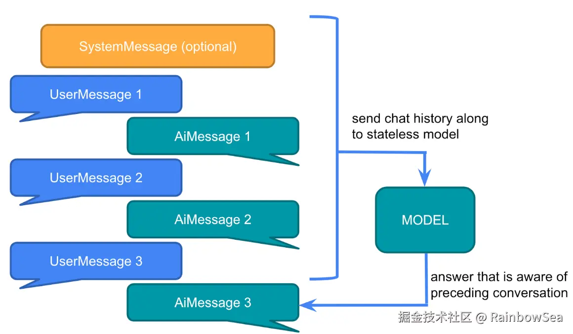 SpringAi提供了一个ChatMemory的组件用于存储聊天记录,允许您使用 LLM 跨多个交互存储和检索信息。并且可以为不同用户的多个交互之间维护上下文或状态。 可以在每次对话的时候把当前聊天信息和模型的响应存储到ChatMemory, 然后下一次对话把聊天记录取出来再发给大模型。