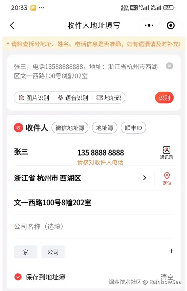 .user("收货人:张三,电话13588888888,地址:浙江省杭州市西湖区文一西路100号8幢202室")