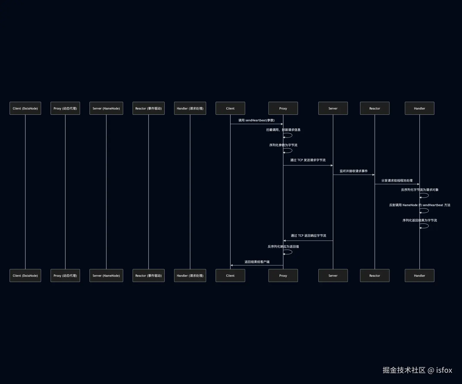 以 DataNode 向 NameNode 发送心跳请求(sendHeartbeat 方法)为例,完整流程如下:
