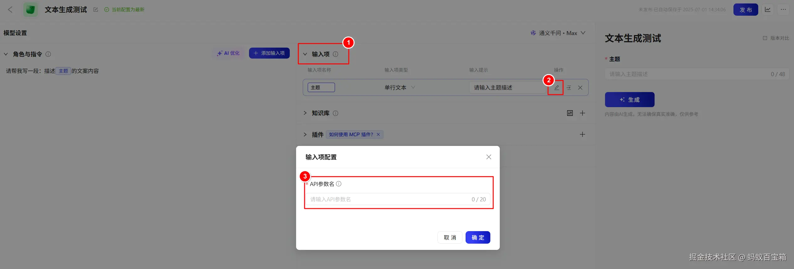 | inputs.key | 是 | String | 指在智能体输入项中自定义的 API 参数名。获取路径: 生成型智能体配置页 > 输入项 > 目标参数 > | |