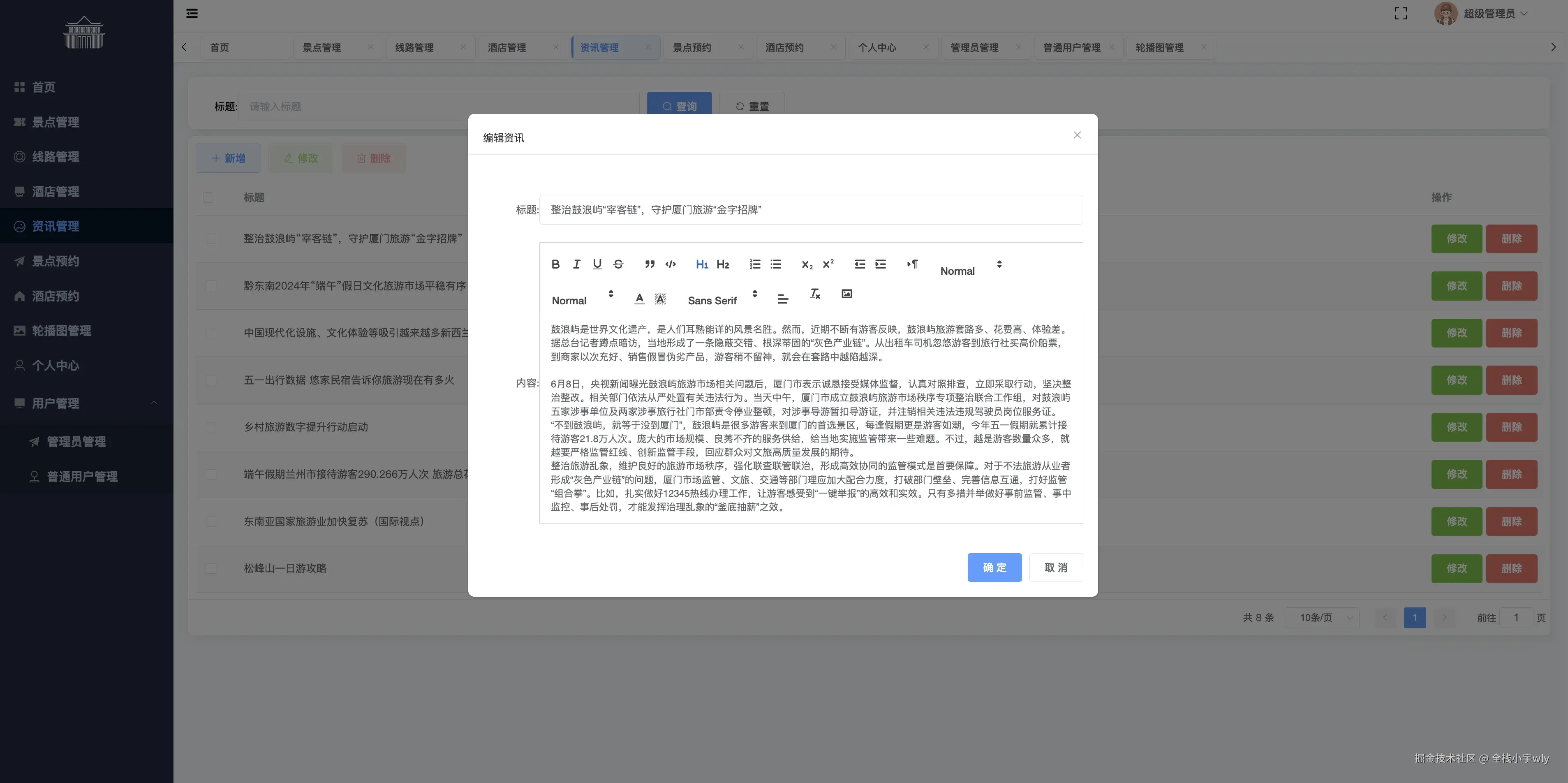 - 管理端面向管理员,涵盖登录、首页、用户管理、景点管理、线路管理、酒店管理、资讯管理、景点预约、酒店预约、轮播图管理、个人中心等功能。