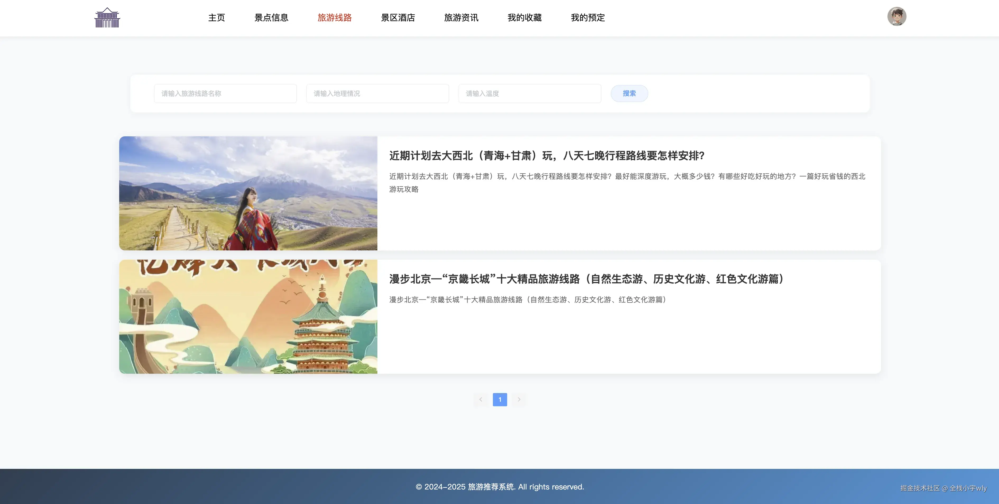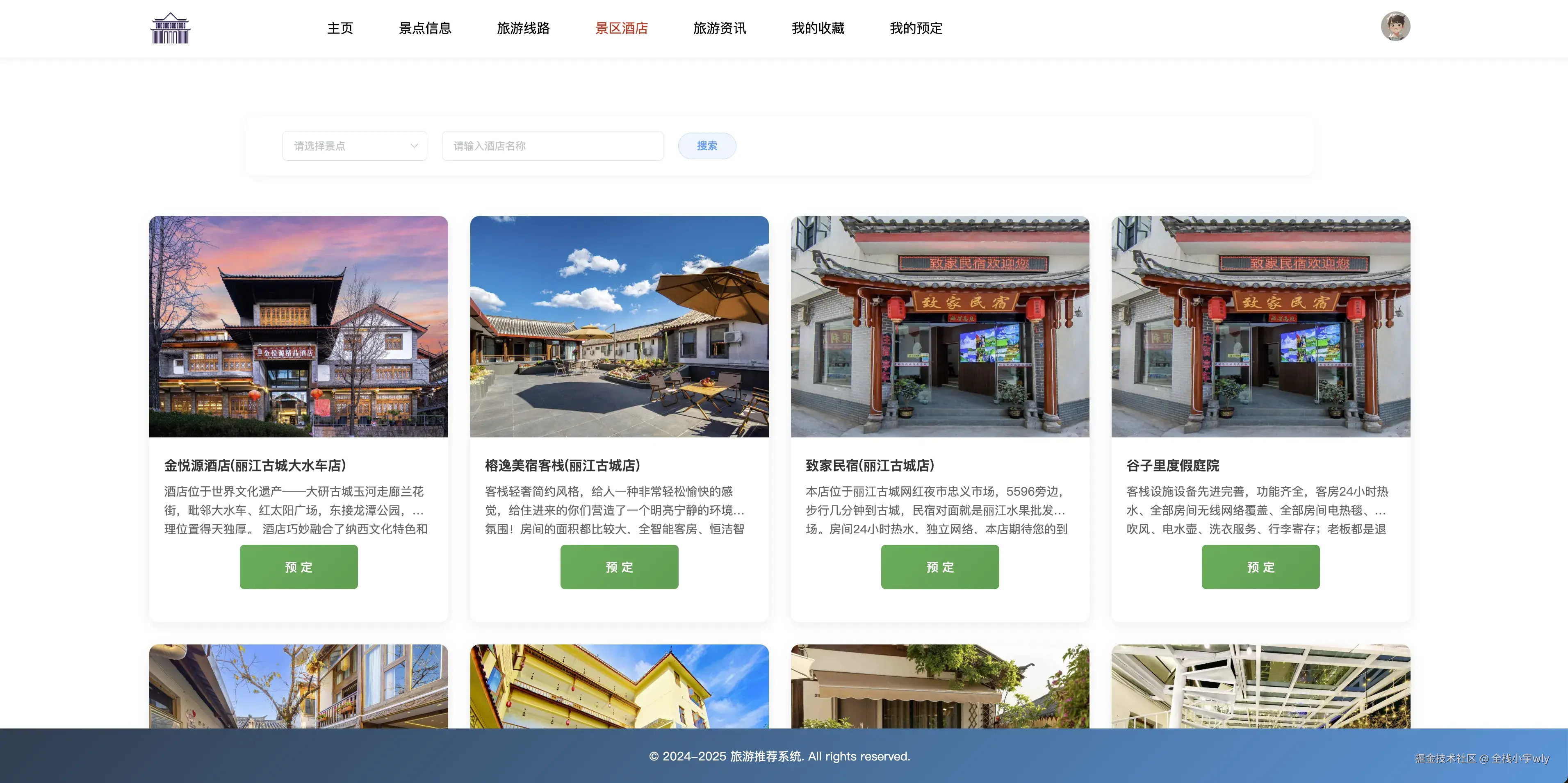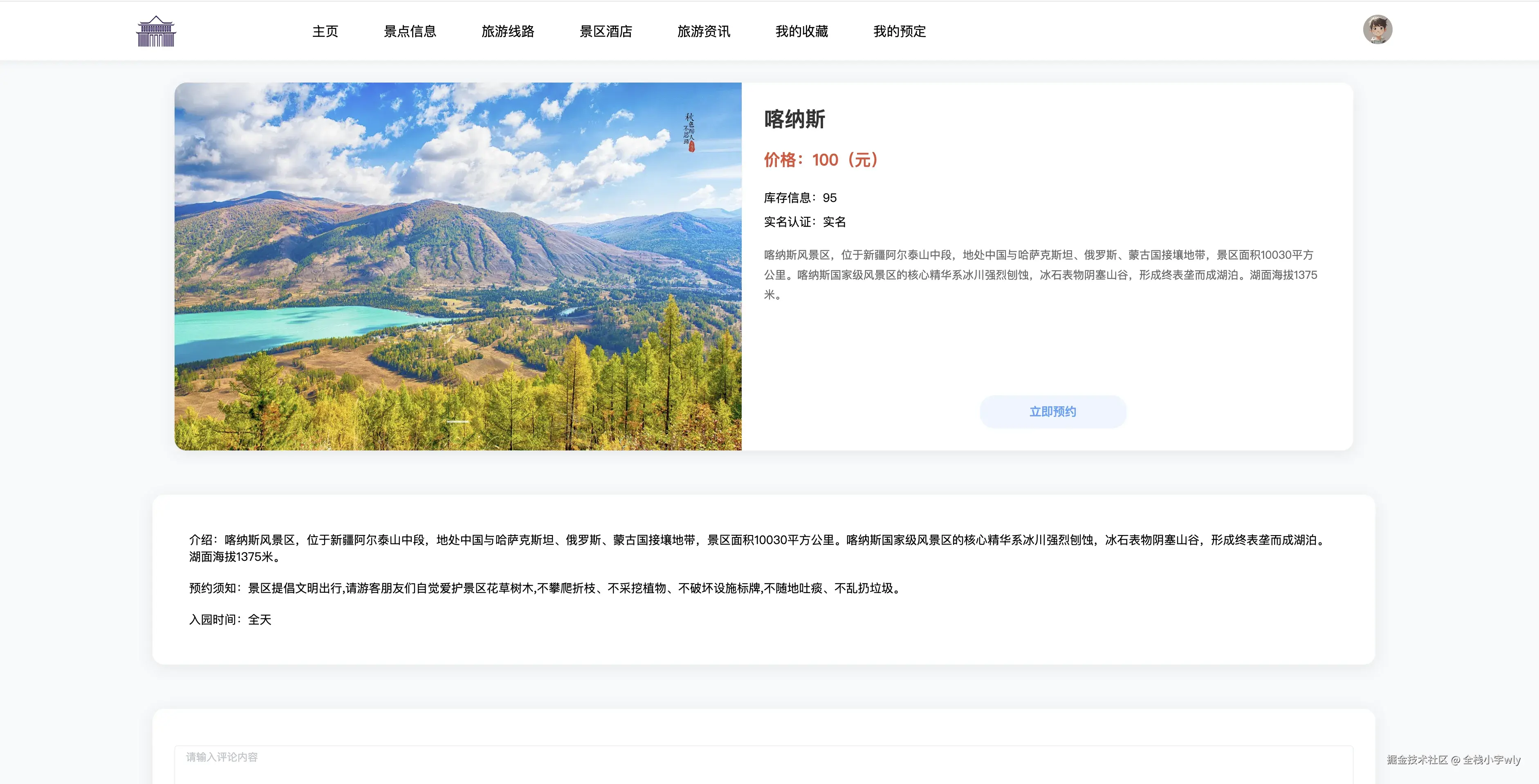 - 多维旅游服务集成:系统融合景点、线路、酒店、资讯等资源,支持预约、收藏与智能推荐,覆盖用户旅游决策与出行管理全流程。