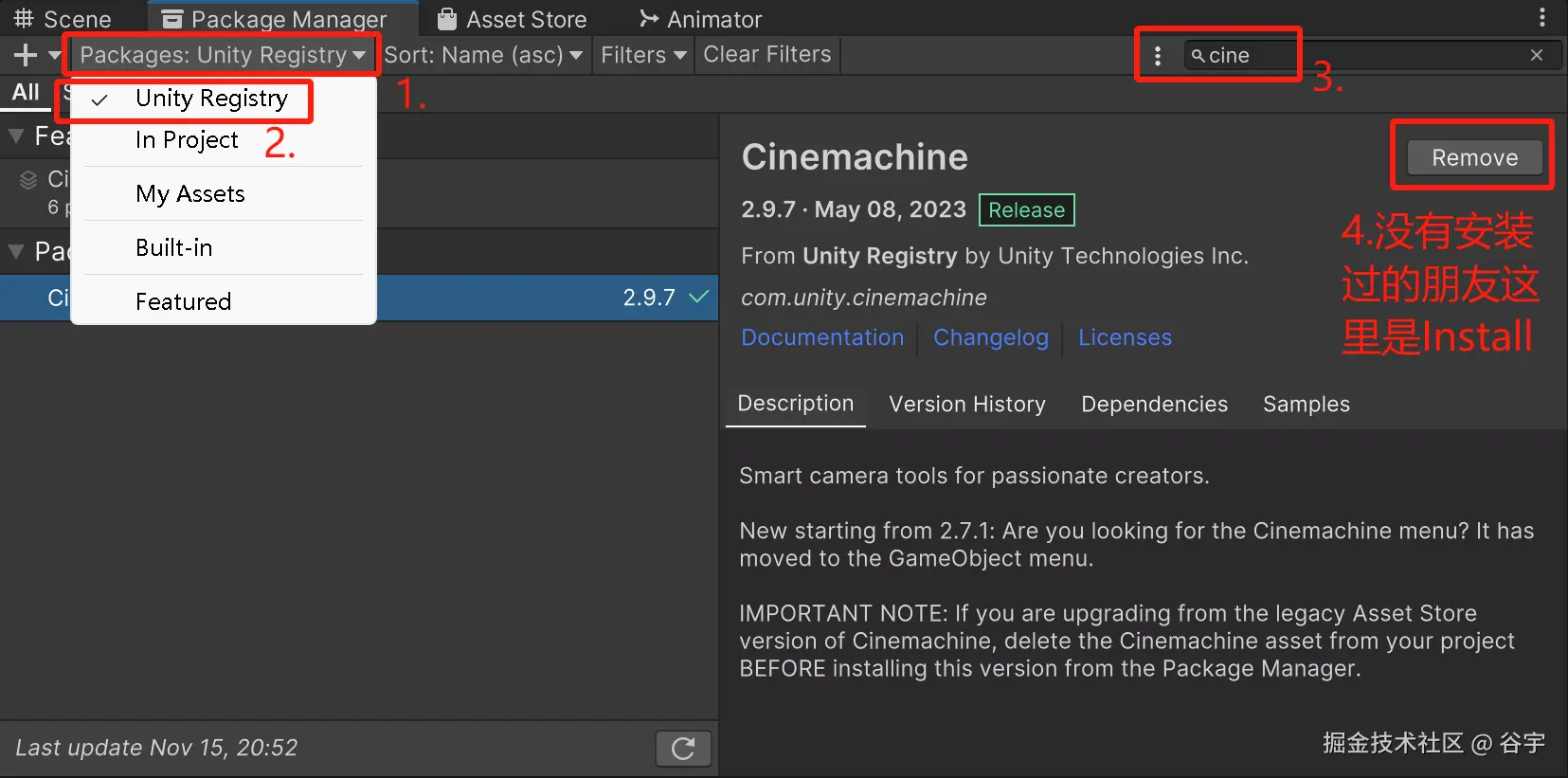 2、在Unity的Package Manager界面中,点击“Packages”部分。会弹出一个下拉框,你可以选择第一个选项是“Unity Registry”。接下来,在搜索框内输入“Cinemachine”来查找插件。再点击“install”按钮进行安装。(注意:如果你已经安装过该插件,那么显示的按钮会是“Remove”,而未安装的用户则会看到“install”按钮。