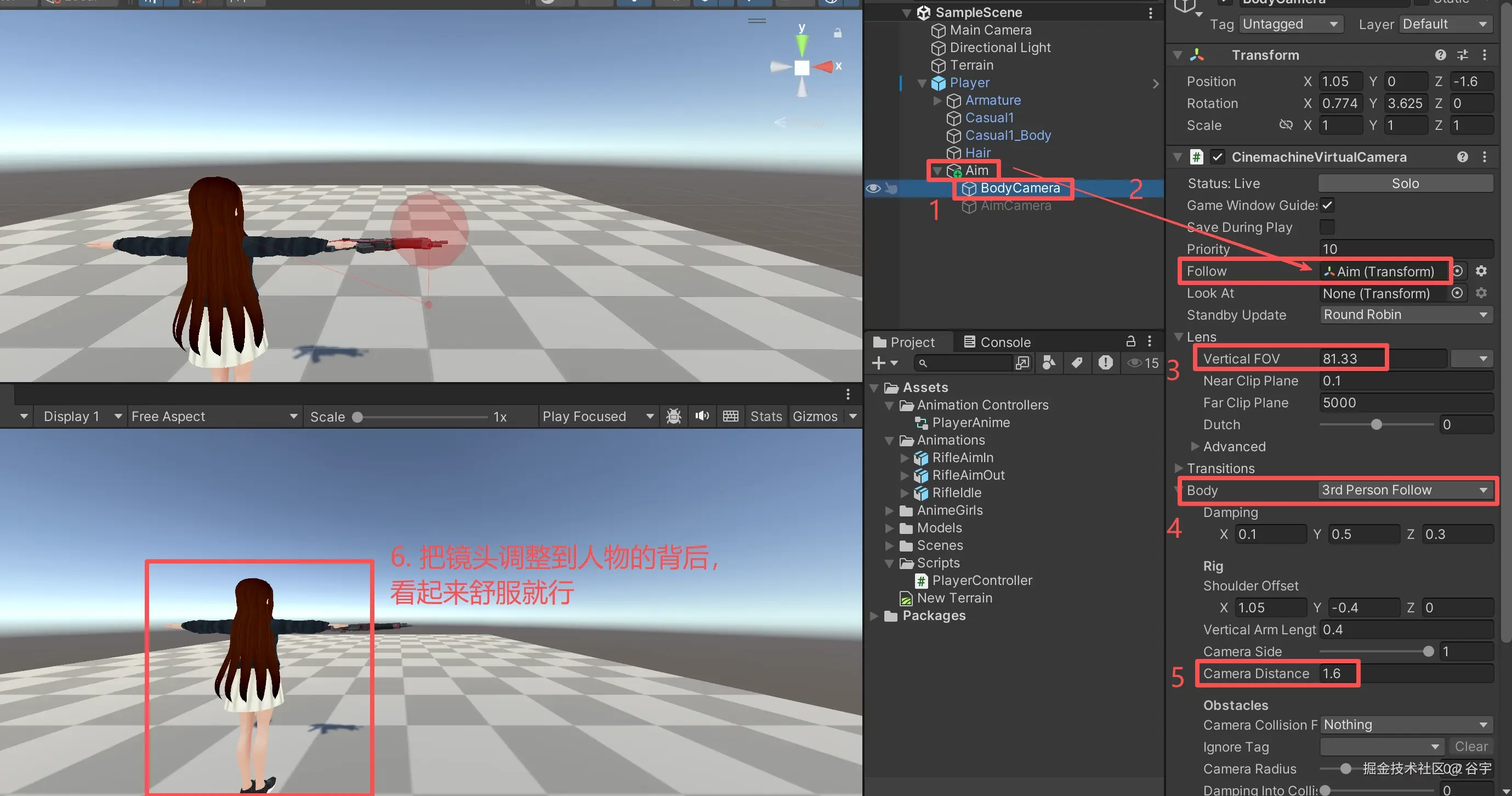 1、我们再次选中角色下的空物体,再创建一个“Virtual Camera”虚拟摄像机(我这里命名为“AimCamera”),在左侧属性栏中,同样把空物体拖拉到“Follow”属性。把最顶部激活相机的勾选去掉(因为我们在代码中来控制这个瞄准摄像机)。“Prionty”优先级属性调高一点(如果这个摄像机激活,让这个摄像机优先展示)。同样在“Body”类型中,选择“3rd Person Follow”。主要调整“Vertical FOV”缩放属性和“Camera Distance”距离属性。(把镜头拉近,人物调整到瞄准时的位置,自己感觉舒服就行)。