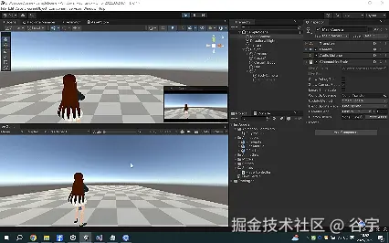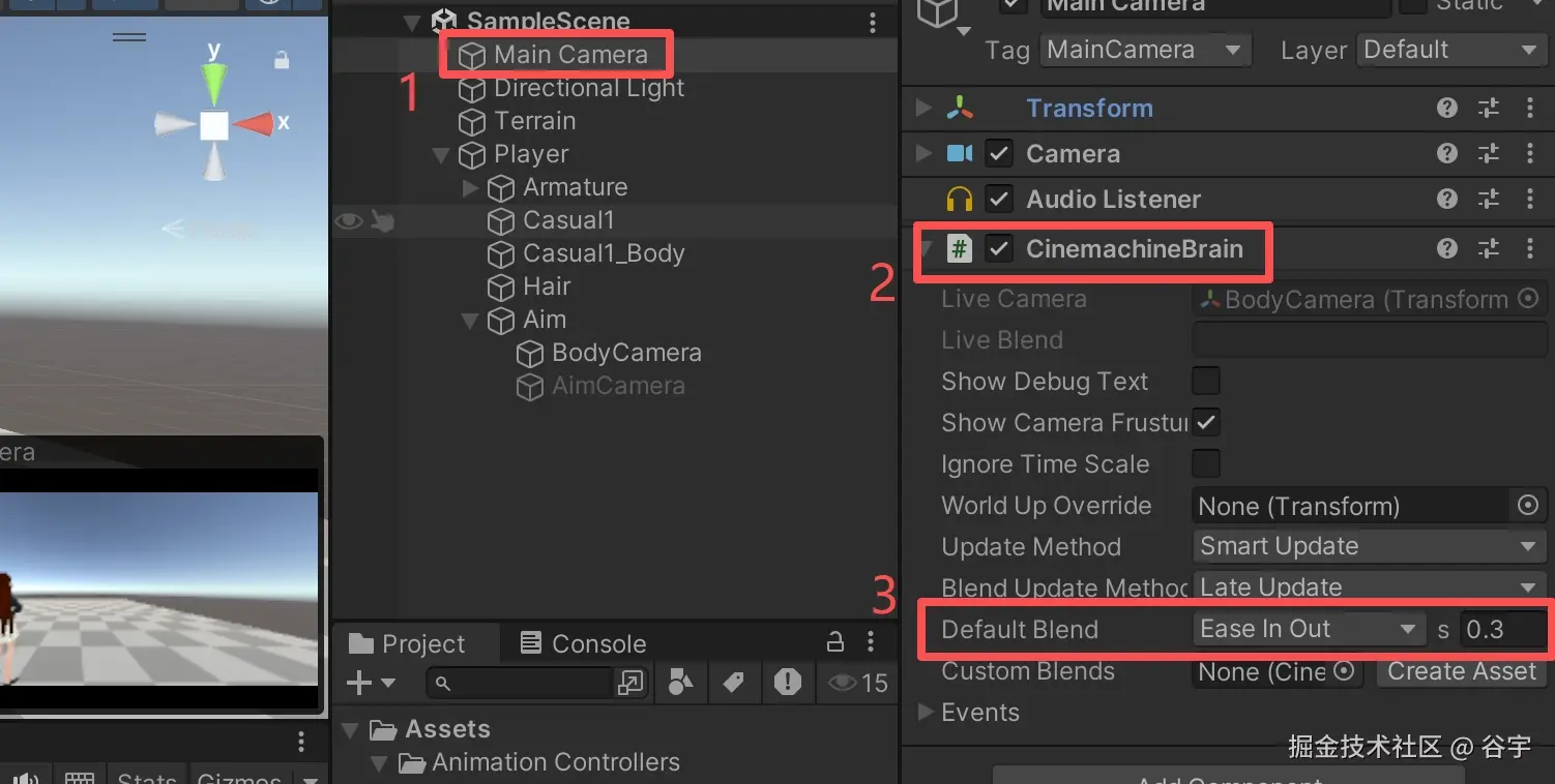 亲测过程:点击“Play Mode”运行案例后,成功实现点击鼠标右键时,角色播放举枪动画,并且镜头切换到瞄准摄像机。松开鼠标右键后,恢复。