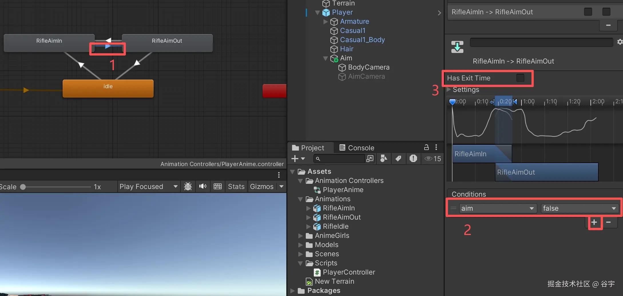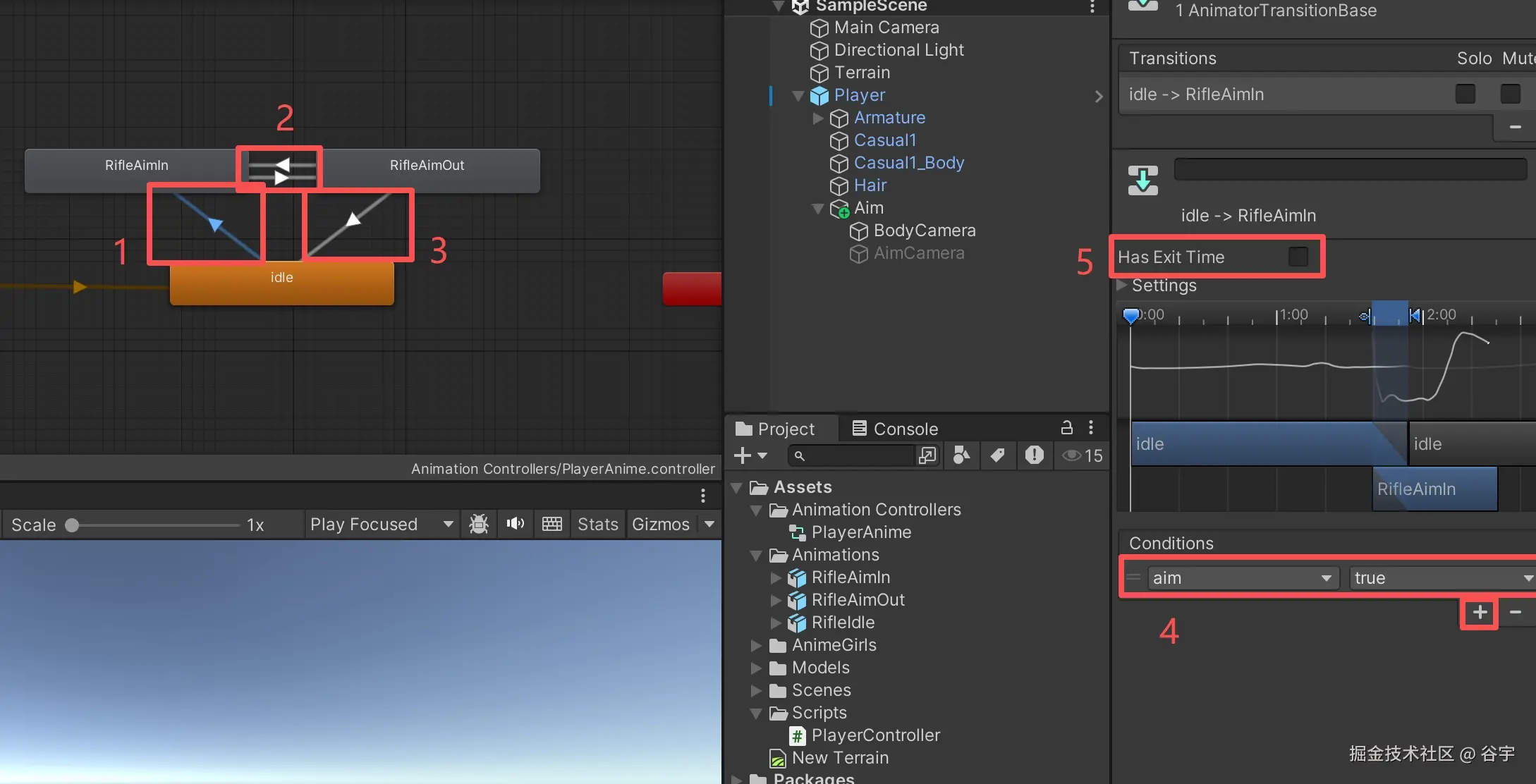4、选中“Idle”(站立动画)与“RifileAimIn”(举枪动画)之间的过渡线,随后右侧菜单中,点击“Conditions”列表下的“+”号,添加“aim”变量,并设置为“true”来触发举枪动画。再在把“Has Exit Time”的勾选去掉,因为举枪动作可以随时执行。
