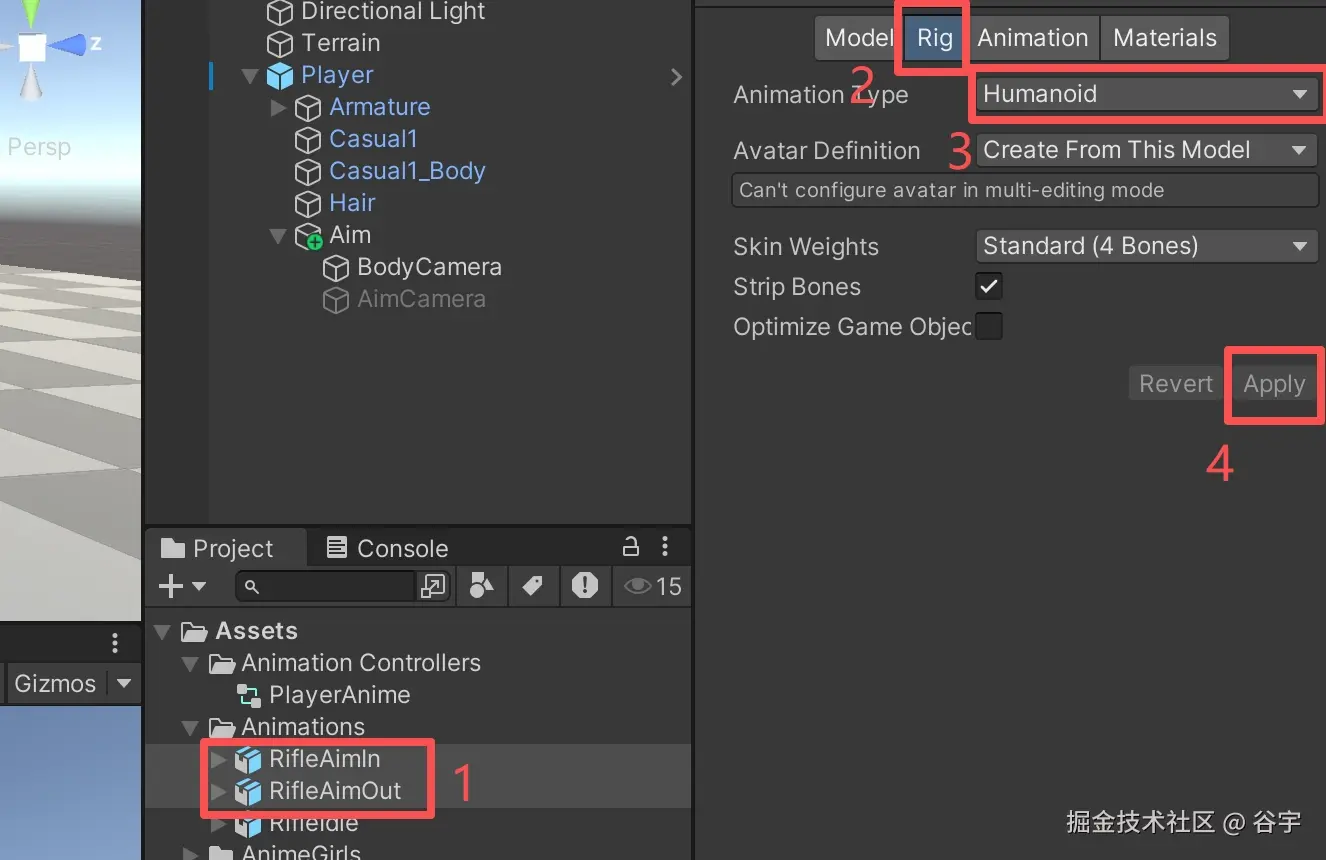 1、我这里已经准备好了举枪动画和放下枪的动画,我们选中所有的动画,接着我们需要点击右侧菜单栏中的“Rig”页签,在“Animation Type”选项中,选择“Humanoid”,然后点击“Apply”应用。
