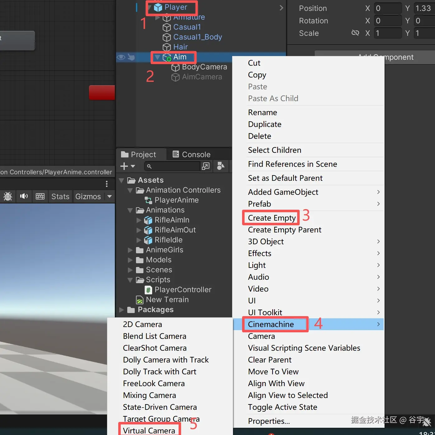 1、我们在“Unity”的“Hierarchy”页签中,选中我们的角色,点击鼠标右键,在角色下创建一个空物体(我这里命名为“Aim”,建议把空物体拖拉到人物的颈部位置)。再选中空物体,点击鼠标右键,选择“Cinemachine”,再点击“Virtual Camera”创建虚拟摄像机(我命名为“BodyCamera”)。