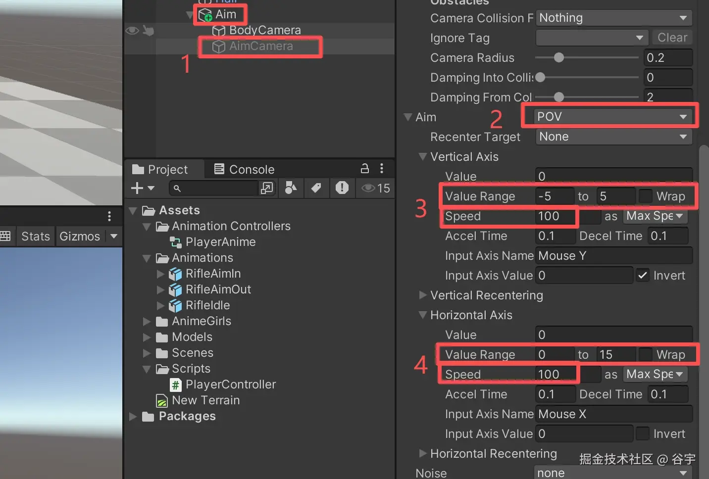2、下拉瞄准摄像机的左侧属性栏,展开“Aim”属性,并选择“Aim”下拉框中的“POV”(镜头跟随鼠标移动)。随后调整“Vertical Axis”垂直度的范围和移动速度,再调整“Horizontal Axis”水平度的范围和移动速度即可。