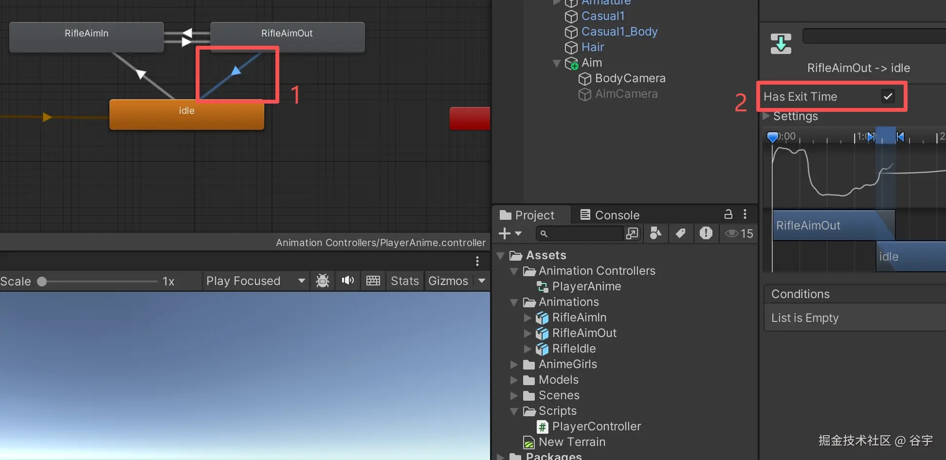 6、点击最后一条过渡线(“RifileAimOut”与“Idle”),确保“Has Exit Time”的勾选上即可,因为我们需要等待放下枪的动画播放完整。