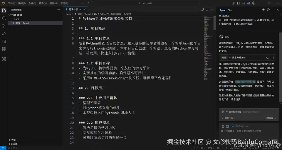 今天,我将使用Comate来实现从零全栈开发一个Python学习网站,在此期间,Comate一人分饰多角:产品经理、UI设计师、架构师、项目Leader、前端工程师、后端工程师、测试...拥有Comate,你就拥有了一只团队。