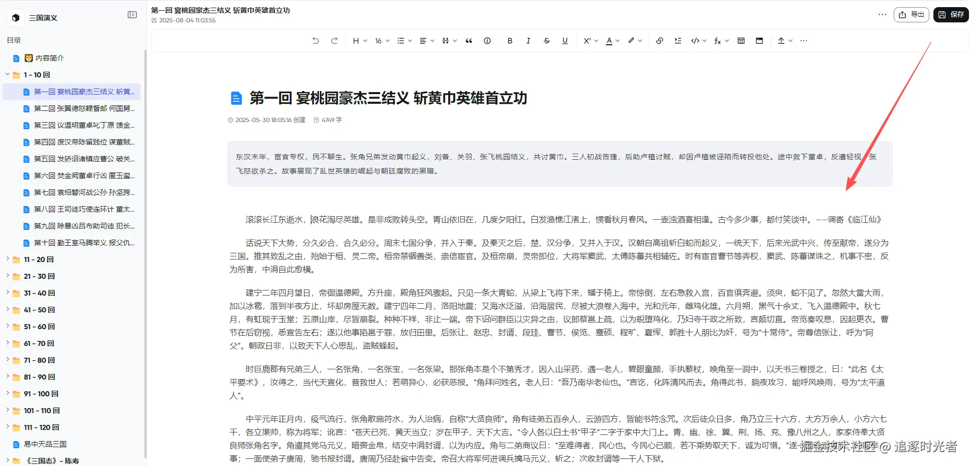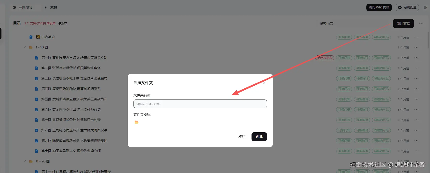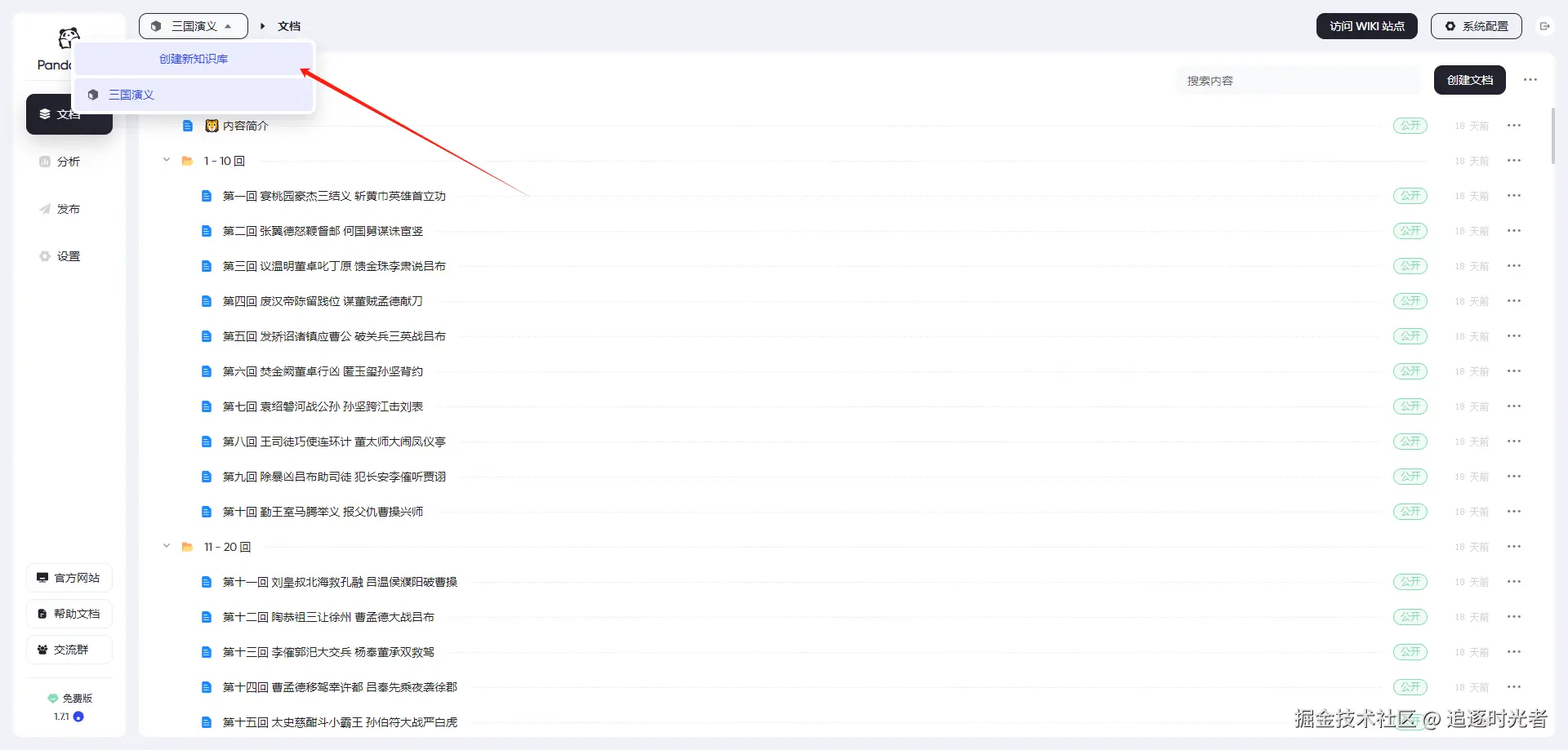 上面我们创建好了三国演义的知识库,接下来我们为知识库创建并完善对应的文档: