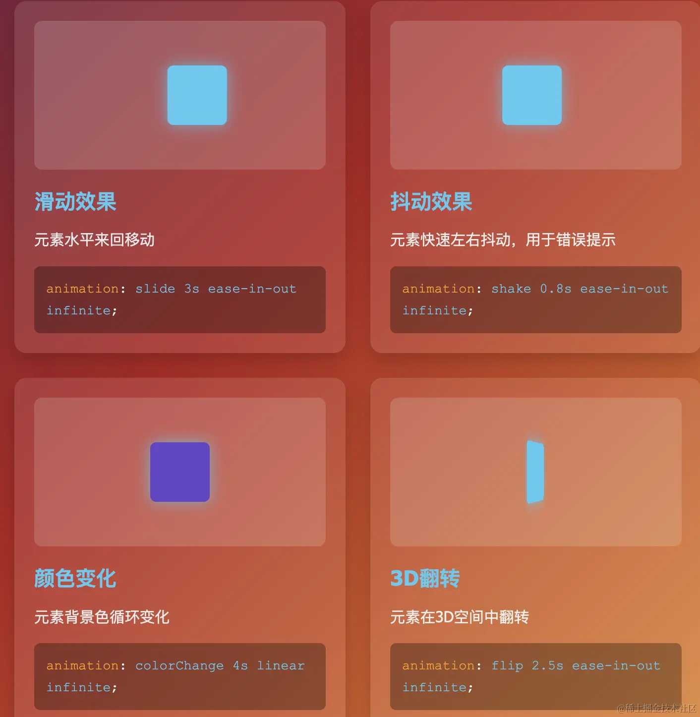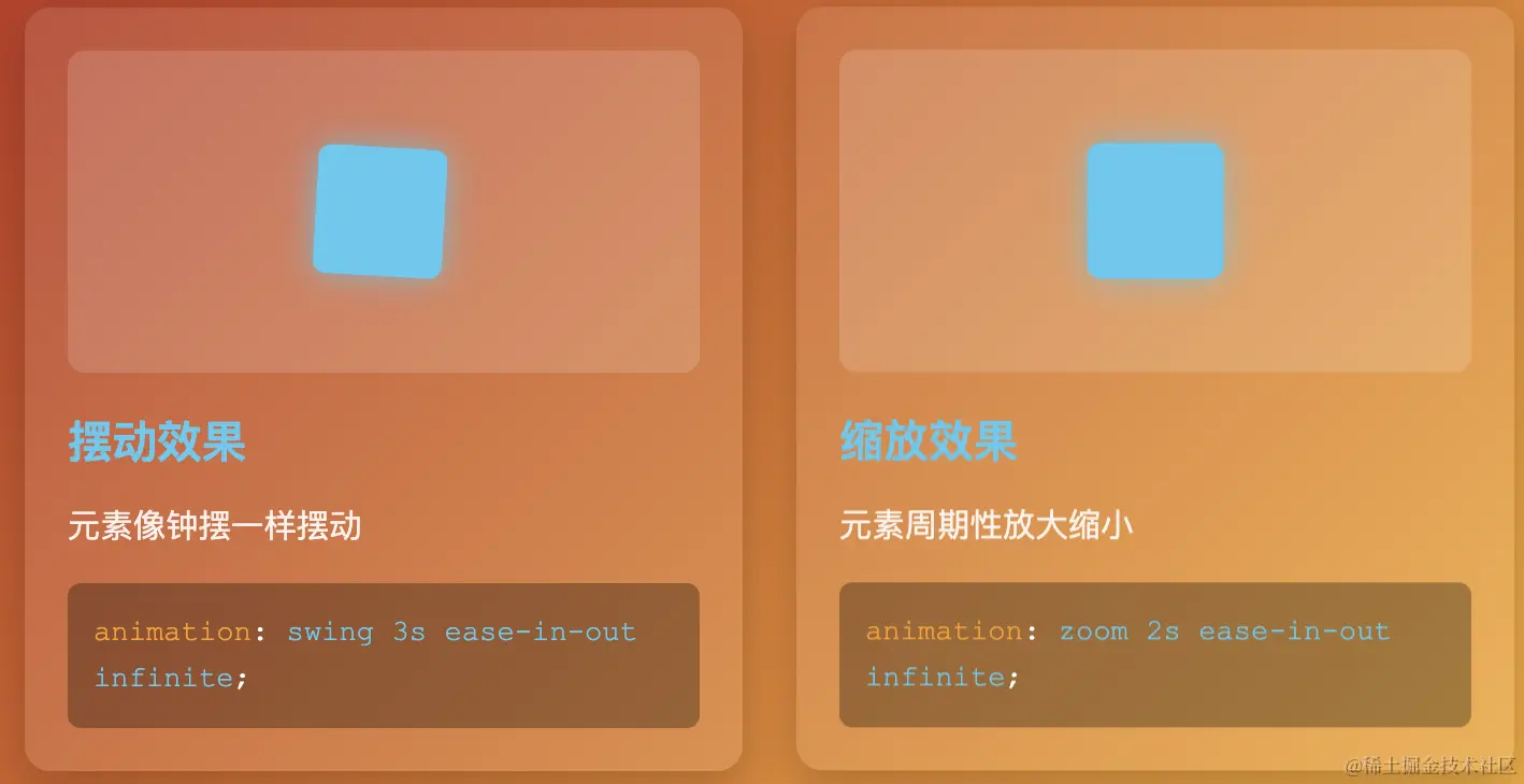 <p class="subtitle">展示10种常用的CSS动画简写方式,可直接复制使用</p>