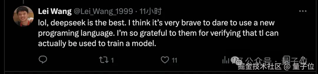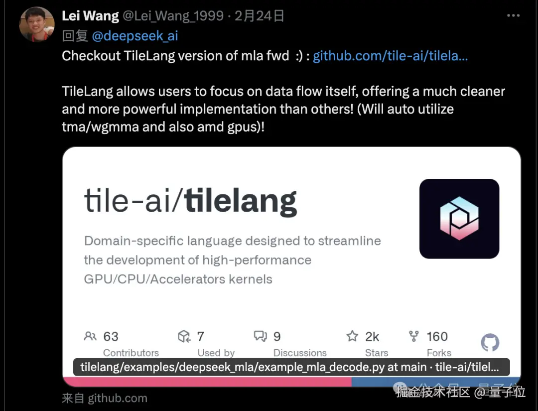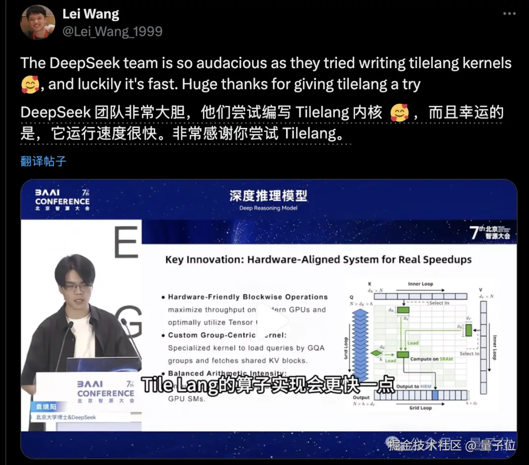 TileLang 的发起人之一,北大博士研究生王磊当时还专门发帖感谢 DeepSeek 尝试他们的语言。