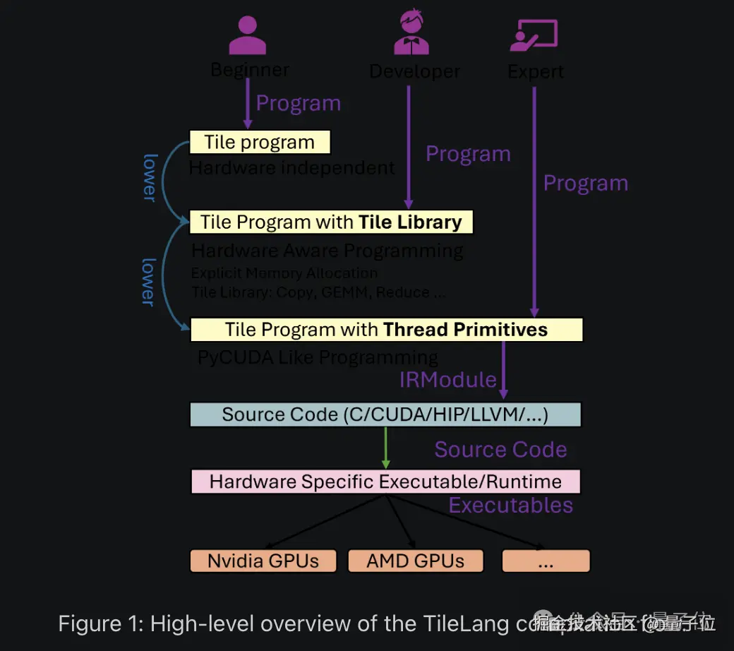 简单来说,Tile 语言 (tile-lang) 是一种简洁的领域专用语言,旨在简化高性能 GPU/CPU 内核的开发。tile-lang 采用 Python 式语法,并在 TVM 之上构建底层编译器基础架构,使开发者能够专注于提高生产力,而无需牺牲实现最佳性能所需的底层优化。