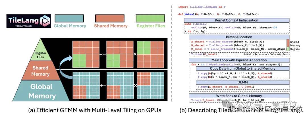 TileLang 将 “Tile” 作为编程模型的核心概念,通过显式的 Tile 抽象,让开发者能够直观地控制数据在全局内存、共享内存和寄存器之间的流动。