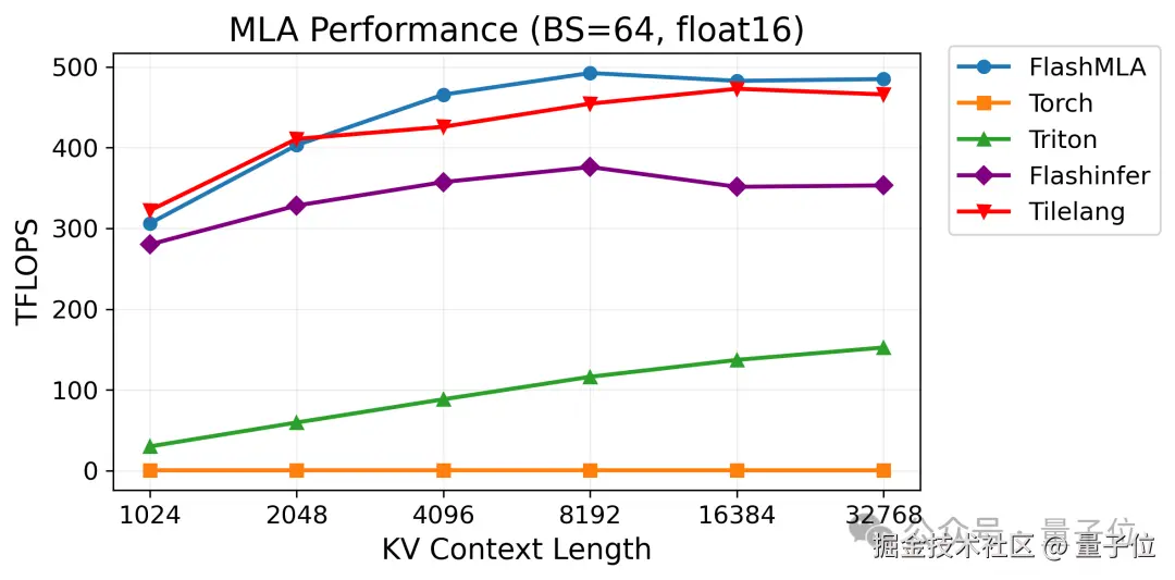 后来 TileLang 也以 DeepSeek 在这天发布的 FlashMLA 内核作为评测基准,在 H100 上的 MLA 解码速度,TileLang 编写的内核做到与 FlashMLA 相当。